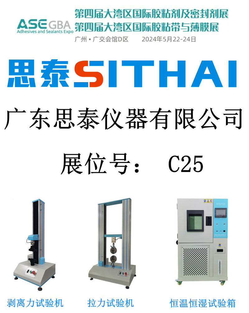 2024年5月22-24号第四届大湾区国际胶粘剂及密封剂展将在广州举行,主题为“胶连世界,智粘未来”。展会将汇聚320家展商和12000名专业观众,涉及胶粘剂、密封剂等领域。同期将举办多场论坛和会议,探讨行业前沿技术和市场趋势。展会是了解行业动态、拓展商机的重要平台。 广东思泰仪器有限公司参加2204年第四届大湾区国际胶粘剂及密封剂展,展位号:C25,展出机器有:ST-D200电脑式剥离力试验机,ST-S2000双柱拉力试验机,ST-H80-40M恒温恒湿试验箱,ST-KX35精密烤箱,NDJ-8S旋转粘度计,欢迎新老顾客前来参观指导。