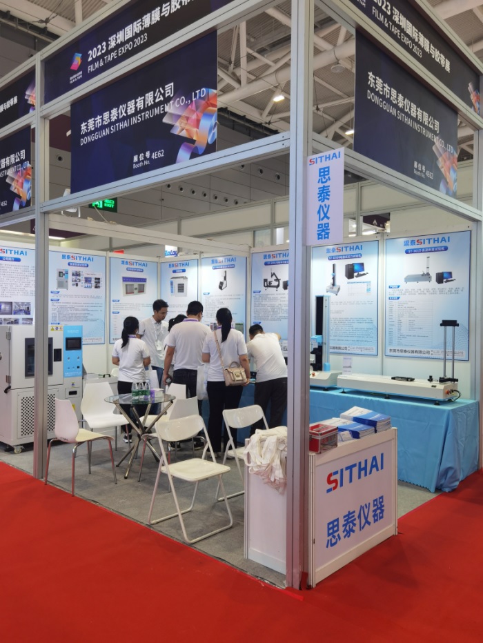 为期三天的2023深圳国际薄膜与胶粘展在深圳宝安国际会展中心举办,展会时间:2023年10月11日-10月13日,东莞市思泰仪器有限公司携手同行展位号4E62,展出产品有:剥离力试验机,高速剥离力测试仪,恒温恒湿试验箱,高温烤箱,雾度透过率测试仪,水滴角测试仪,胶带保持力试验机等胶带粘检测仪器,并成功圆满完成这次展会,再次感谢新老客户的参观与指导。