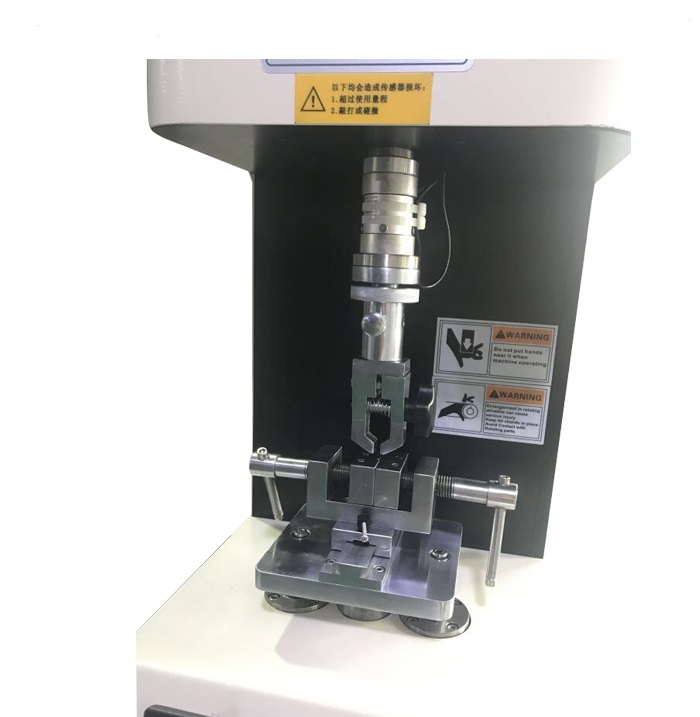 拉链扭力试验机系用来测试拉链头的扭力强度,测试时将拉片与拉链头分别固定,然后以每分钟1.5 圈的速度进行扭转,待其破坏后,显示屏会保留其最大的扭力值,作为质量改良的参考依据。